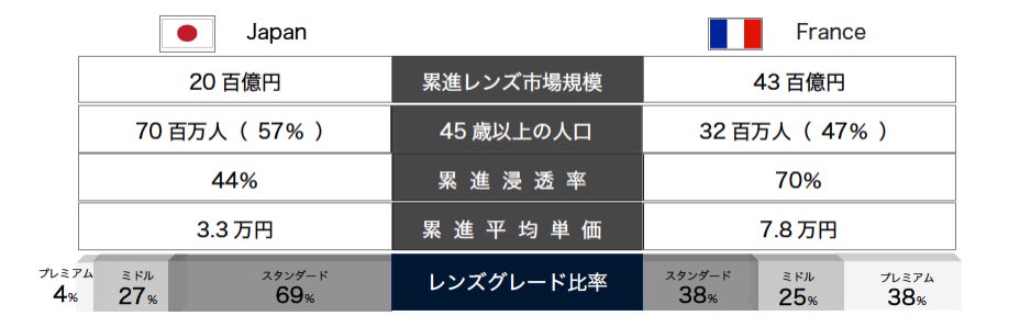 | 老眼の始まり ターニングポイントは45歳 「ある日の夕方、突然手元が見えづらくなった」、こんな経験があるのでは?歳をとりシニアになって老眼に行き着くと思われがちですが、人の目は10歳を過ぎたあたりから少しずつ機能が低下しています。 年齢と共に遠くなる近点調節力(近くに焦点を合わせる能力)を使って最も近くを見ることができる距離のことを近点と言います。 ![]() 10歳では、十分な調節力を有しているので眼前8cmくらいまでよく見えますが、その機能が劣化するため20歳ではその距離は約11cm、30歳で約14cm。そして40歳で約22cmまで遠ざかります。スマートフォンや読書では眼前から手元まで20~30cmの距離で見ているため、この段階ではあまり不便を感じません。しかし、45歳を過ぎたあたりから、近点は35cmを超え、スマートフォンを見る手元に焦点が合わなくなるのです。老眼は突然始まるのではなく、徐々に機能が落ちていき、近点が30cm前後になった時に、老眼になったと自覚するのです。50歳で約50cmになり、老眼現象は60歳で約100cmまで遠ざかっていくと言われています。 老眼率世界No.1の老眼大国ニッポン ![]() 2023年現在、日本の人口は約1億2400千万人、老眼のターニングポイントである45歳以上は約7000万人です。その割合は56%で、つまり人口の半数以上が老眼という老眼大国なのです。そして、2045年には45歳以上の人口は全体の61%まで増加すると言われています。 現代人の目に起きている異常事態 現代のデジタル社会では莫大な情報に溢れています。移動中でさえもスマートフォンやタブレット、運転中のカーナビゲーションなど様々なデバイスから情報を得ており、その眼で見る情報量の処理スピードは一層加速しています。マルチタスキングが当たり前の現在の環境において、私たちは眼を絶えず動かし続け、鮮明な視界を維持するために目を酷使し、負担をかけています。「現代人の目に異変が起こっています。人類はかつて経験したことのないような近い距離を長時間見続けることによってピントを合わせる調節機能と、両眼視をよくするために、両眼をうちに向ける輻輳機能に異常が生じています。」と、“目の博士”として知られる梶田眼科院長、梶田政義医師は答えます。 生活者が抱える“見る”ことへの3つの不安心理 では、実際に“見る”ことにたいし具体的にどのように感じているでしょうか。バリラックスは45歳以上の生活者にヒアリングを実施しました。仕事や生活において“見る”ことに苦労していること、そして「機能的な悩み」「情緒的な悩み」「将来への不安」の3つの不安心理が存在することがわかりました。 『機能的な悩み』会議の資料を読む気にもならないゴルフに行った時にドライバーで打ったボールを見失う大好きだった読書が億劫になってきた美術館巡りが趣味だったがキャプションが小さいためストレス解消の趣味が逆にストレスになってしまった運転中、遠近感の識別が瞬時にできず危なく感じる『情緒的な悩み』近くも遠くも見えないのはエイジングのシグナル老人になったように感じる『将来への不安』今後もどんどん見えなくなっていくのではないか心配 日本人の老眼対策の遅れ エシロール社による遠近両用レンズの普及率調査では、フランスは70%、アメリカが53%、そして日本は44%という結果になりました。普及率には、環境、社会的文化的背景、眼鏡業界の取り組みなども関係していますが、老眼人口が世界No.1、デジタル社会の加速、“見る”ことへの具体的な不安、があるにも関わらず、日本は欧米と比較すると老眼対策である遠近両用レンズの普及が遅れをとっているのが現状です。 ![]() 欧米の遠近両用レンズの普及率 なぜ日本の遠近両々レンズの普及率が低いのでしょうか。ニコン・エシロールの消費者調査によると、遠近両用レンズの存在は知っているが、使用したことがなく、また使用する必要性も感じていないという回答が半数近くにのぼります。 ![]() ニコン・エシロールによる消費者調査 n=556,対象:45歳以上, 日本在住のメガネ保有者(対象者の80%が50歳以上) 仕事や生活で“見る”ことの悩みが多く不便や負担を感じているにもかかわらず未使用率が高いということは、老眼への具体的な対策をとっていないと考えられます。この普及率の低さの背景には、正しい老眼対策の情報を得られていない、とも考えられます。そして、日本には“見る”ことに対しての心理的不安を抱えたまま、快適な生活を過ごせていない45歳以上の人口が世界的にみても多いのです。 日本とフランスの累進レンズ市場の違い 遠近両用レンズの普及率が非常に高いフランスと老眼大国日本の累進レンズ市場を比較しました。 ![]() 市場規模では、フランスが日本の2倍以上であるのにたいし、45歳以上の人口は1/2以下です。浸透率にも大きな差が見られます。この市場規模の開きには、累進レンズを装用した眼鏡の平均単価も関係しています。日本の平均単価は3万3千円で