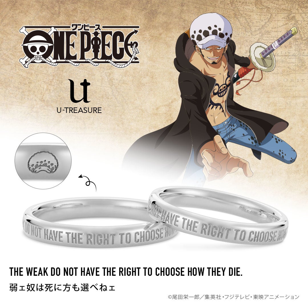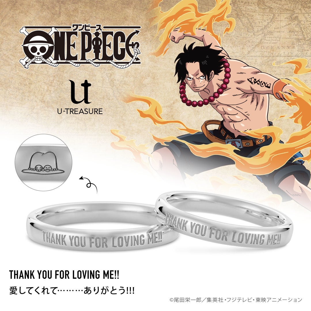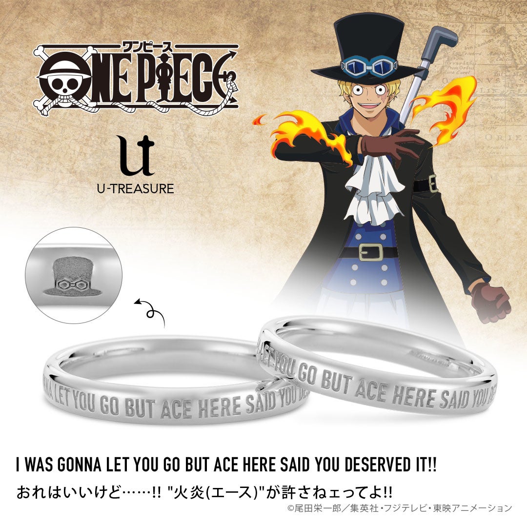 大人のための本格的なキャラクタージュエリーを扱うユートレジャー(東京都豊島区:代表取締役:伊藤 崇史)は、『ONE PIECE(ワンピース)』のプラチナ製リング(指輪)4種類を、8月24日(水)に発売します。このたびの新作は、表に、コビー、サボ、エース、ロー、それぞれの名言を英文で刻み、内側には各キャラクターのマークを入れました。勇気を与えてくれるキャラクターたちの名言をさりげなく身につけられるデザインです。名言をペアで刻んでおふたりの永遠の証にも。ご成約特典として、商品1点につき、「U-TREASUREオリジナル ジュエリークロス」1点をプレゼントいたします。ユートレジャーコンセプトストア池袋、ユートレジャーオンラインショップにて取り扱います。こちらの商品は今後、シルバーなど別素材のリング(指輪)の展開も予定しています。