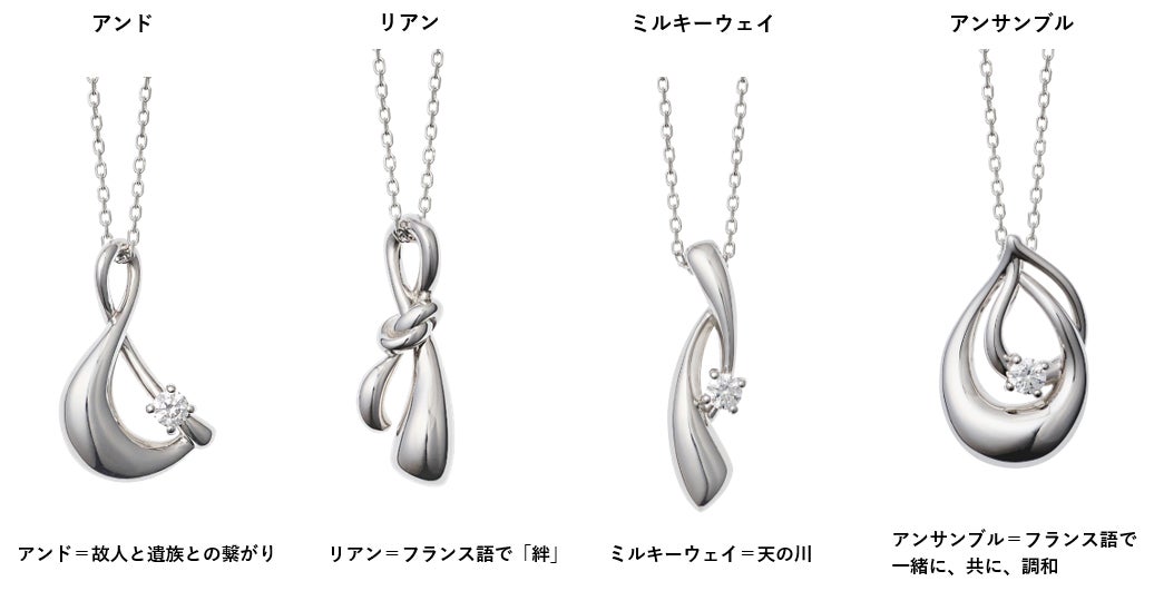 ・故人と、遺された人との絆を「&」の文字に込め、「&」をモチーフにデザインした流れるようなフォルムの4つのデザイン