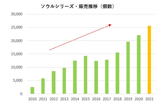 当社では、「ソウルジュエリー」「ソウルプチポット」「ソウルステージ」の3ブランドからなる「ソウルシリーズ」約600種類を販売。累計販売個数は17万個を突破、2021年の販売個数は2010年の約10倍を記録しています。