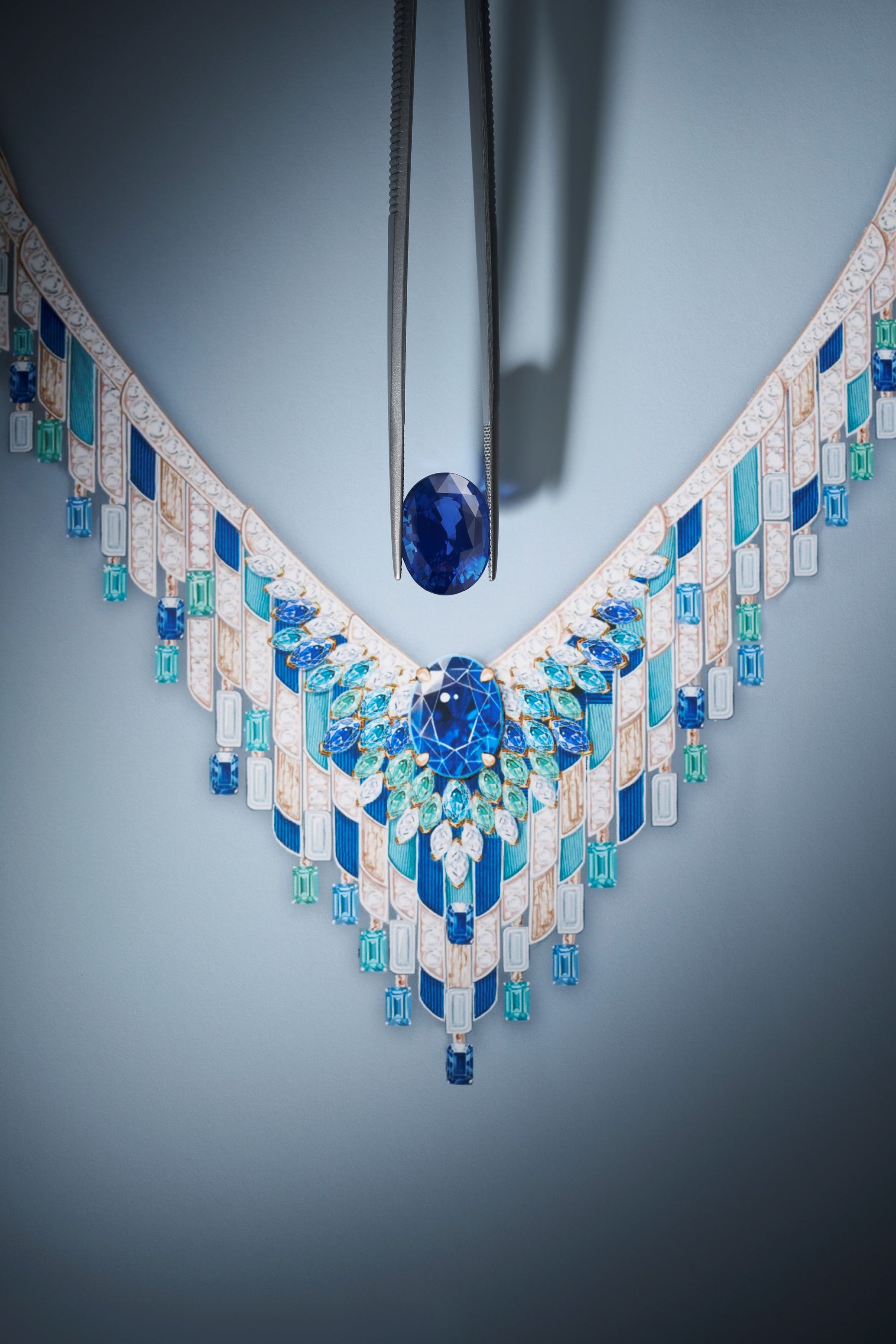 ピアジェのシグニチャーであるブルーのシンフォニーが、宝石を贅沢にあしらったV字型のネックレスに表現されています。中央には、13.05カラットのマダガスカル産オーバル型シェイプカットブルーサファイアと、マーキスシェイプカットサファイア、トルマリン、アクアマリンが2列に配され、その周囲をオパール、ターコイズ、ダイヤモンド、そしてDecor Palace(パレス装飾)がエングレービングされたゴールドのパーツが流麗さを強調しています。これとコーディネートするのが、耳元を華やかに彩り、ピアジェが得意とするイヤカフです。そして、リングがこのセットを完成させ、各ピースの裏面には、「Decor Palace(パレス装飾)」が施されています。