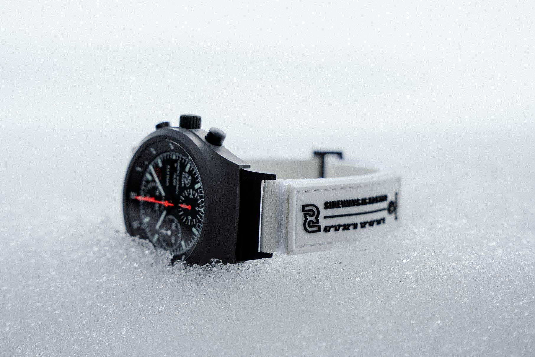 このエディションには、ポルシェ スポーツカーの内装にも使用されているカーフスキン製、クイックチェンジ機構を備えたスレートグレイのストラップと、ツェル・アム・ゼーで開催されるF.A.T.アイスレース開催地の座標を示すバッジが付いているホワイトのテキスタイル・ストラップが付属しています。