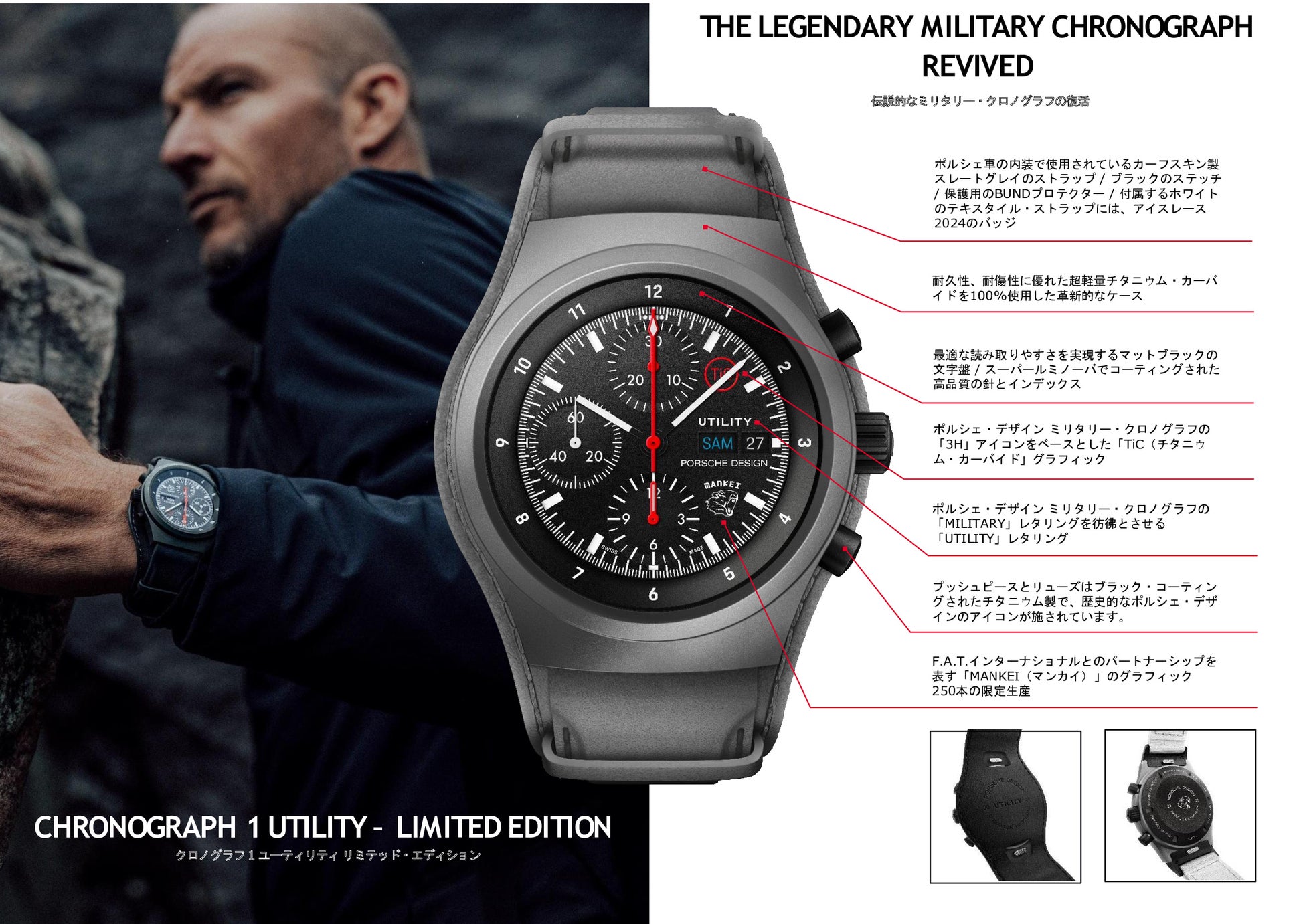 ドイツブランドの時計に特化した輸入代理店、ドイツ時計株式会社(本社:東京都目黒区、代表:葛西憲道)は、<ポルシェ・デザイン>伝説のリストウォッチ「ミリタリー・クロノグラフ」を最先端のテクノロジーで再解釈し誕生した最新作、「クロノグラフ1 ユーティリティ・リミテッド・エディション」の販売を開始いたします。