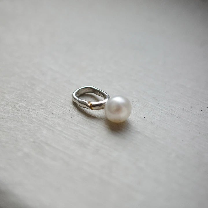 日々研鑽を積むバレリーナが困難を乗り越えようと流す美しい悔し涙をパールに見立てたチャームです。涙がこぼれ落ちたときのかたちと、目標に向かって努力する時に抱える複雑な感情をリングで、前に進む強い意志を金継ぎのような金のラインで表現しました。