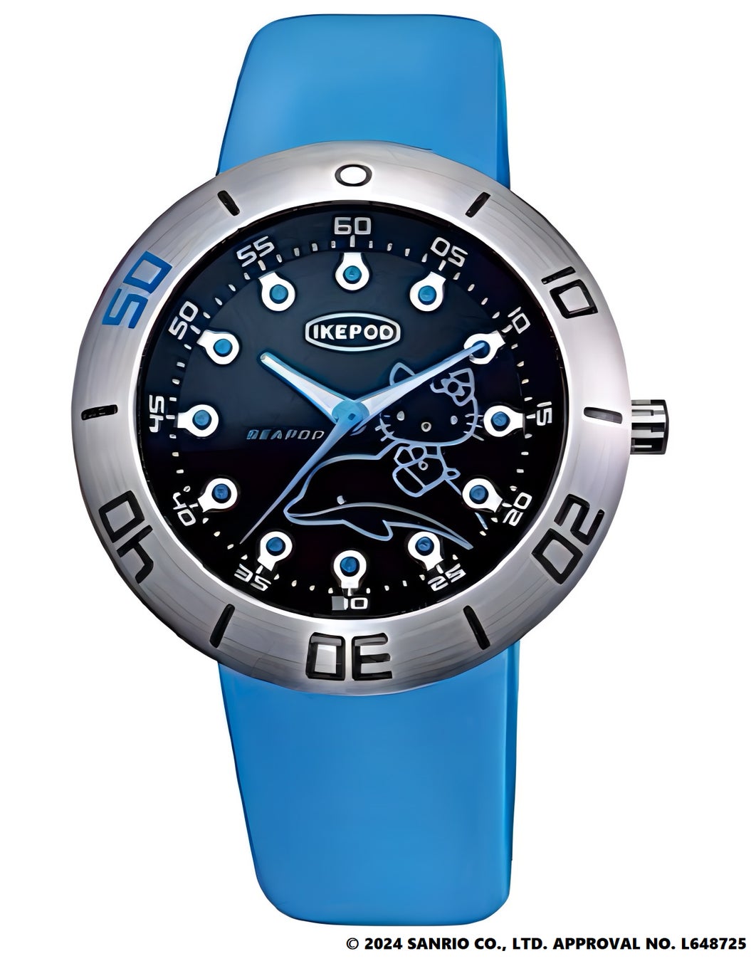 ダイアルにはイルカに乗ったKittyが海原を駆けるイメージを、またベゼルの50分の目盛にシーブルーのカラーを入れ生誕50周年の特別感を演出します。