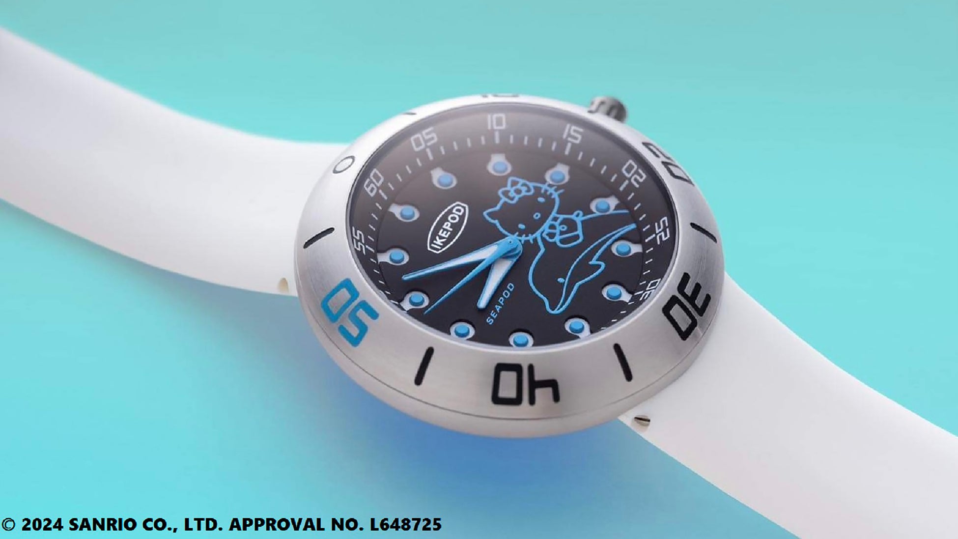 IKEPODを代表するダイバーズウォッチコレクション”SEAPOD”から登場する「Ripple of Kitty/リップル オブ キティ」では、イルカの背に乗ったキティがリップル(さざ波)がたつ海を颯爽とわたっていきます。深い海をイメージしたダークネイビーのダイアルにトーナルで描かれたキティはとてもクール。「身に着けられるアート作品」としてその高いデザイン性でファンを魅了するIKEPODとのコラボレーションならではのキティになっています。