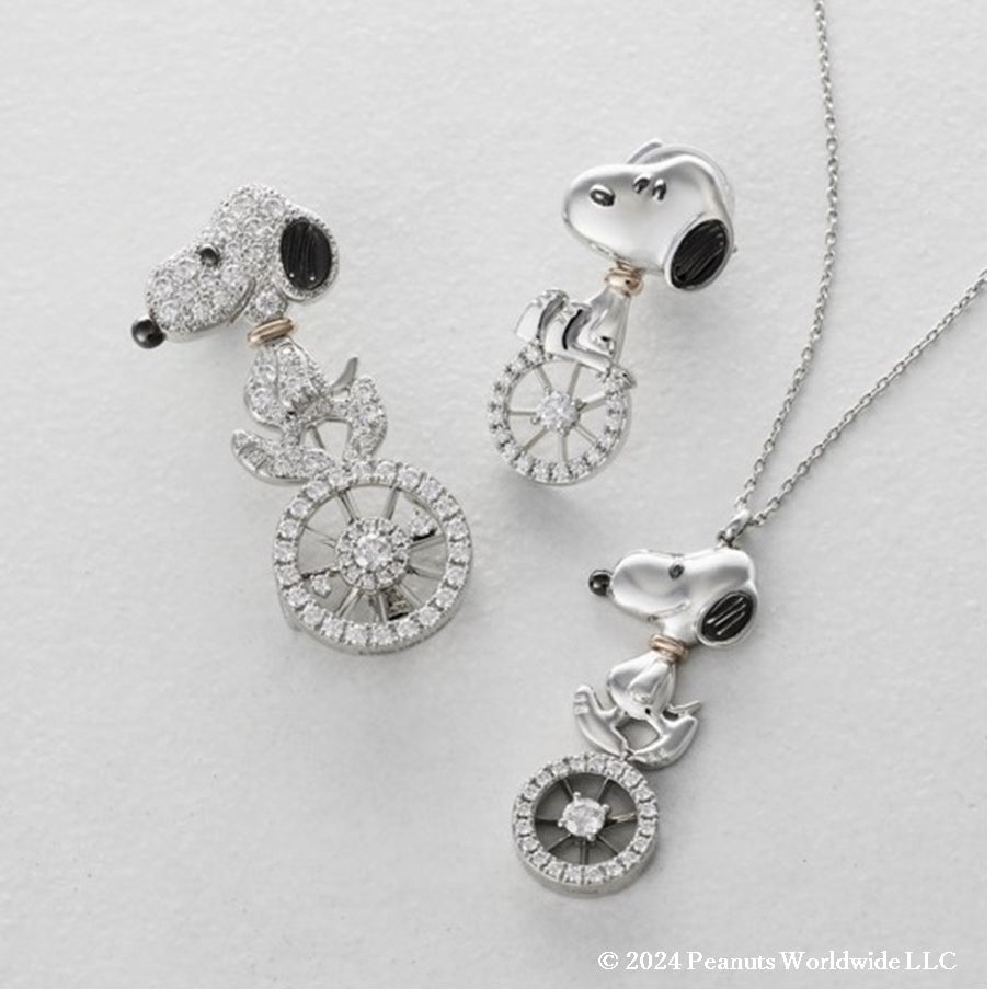 今回発売する新作ダイヤモンドジュエリーは、PEANUTS TMの大人気キャラクター、SNOOPY(スヌーピー)をモチーフに、御所車を象(かたど)ったモダンなジュエリー、『「kagayoi」かぐるまコレクション』として、ブローチ、ピンブローチ、ペンダントの3種類を展開いたします。ダイヤモンドの輝きと車輪のスポークの輝きのコントラストで、華やかさだけではなく装いに上品さを与えるハイジュエリーに仕上げました。