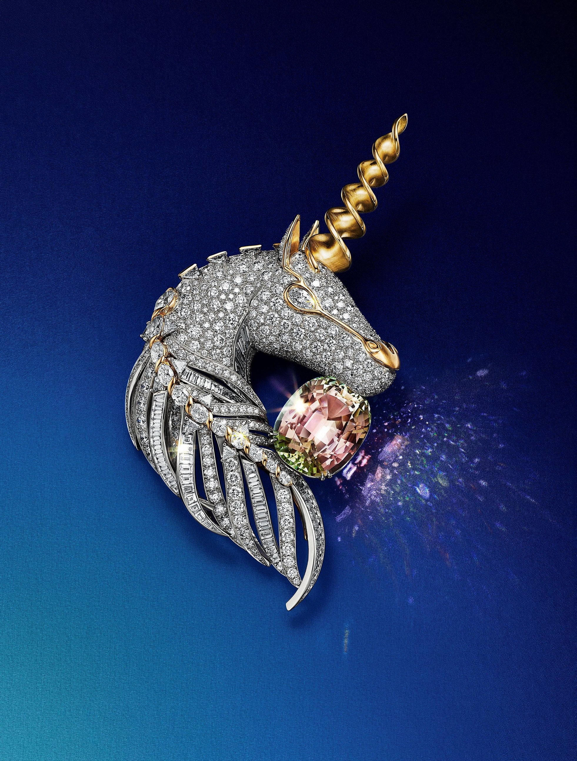 「ユニコーン」は、ジャン・シュランバージェの想像力をかきたてた神話上の生き物で、渦を巻く角が特徴的です。ジャン・シュランバージェの「クレイジー ツイスト」デザインから着想を得たこのテーマは、ダイヤモンドを敷き詰めたツイストシルエットに彩度が高く色鮮やかなパープル サファイヤとピンク サファイヤがセッティングされています。このテーマでは、25カラットを超える幻想的なバイカラー クッション カット トルマリンが輝く、想像力豊かなユニコーンのブローチが登場します。