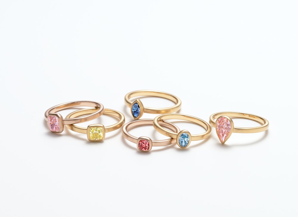 POP UPでのみ販売するカラーラボグロウンダイヤモンドのリングコレクション。ピンクやブルー、イエローといった、華やかなカラーが楽しめます。それぞれ個性を持って生まれるラボグロウンダイヤモンドの色や形をお楽しみいただけるように、石を一つ一つ丁寧に選定して、その魅力が引き立つようにメタルで周囲を覆うようにセッティングしました。ラボグロウンダイヤモンドだからこそ楽しめる絶妙な色合いをお楽しみいただけます。