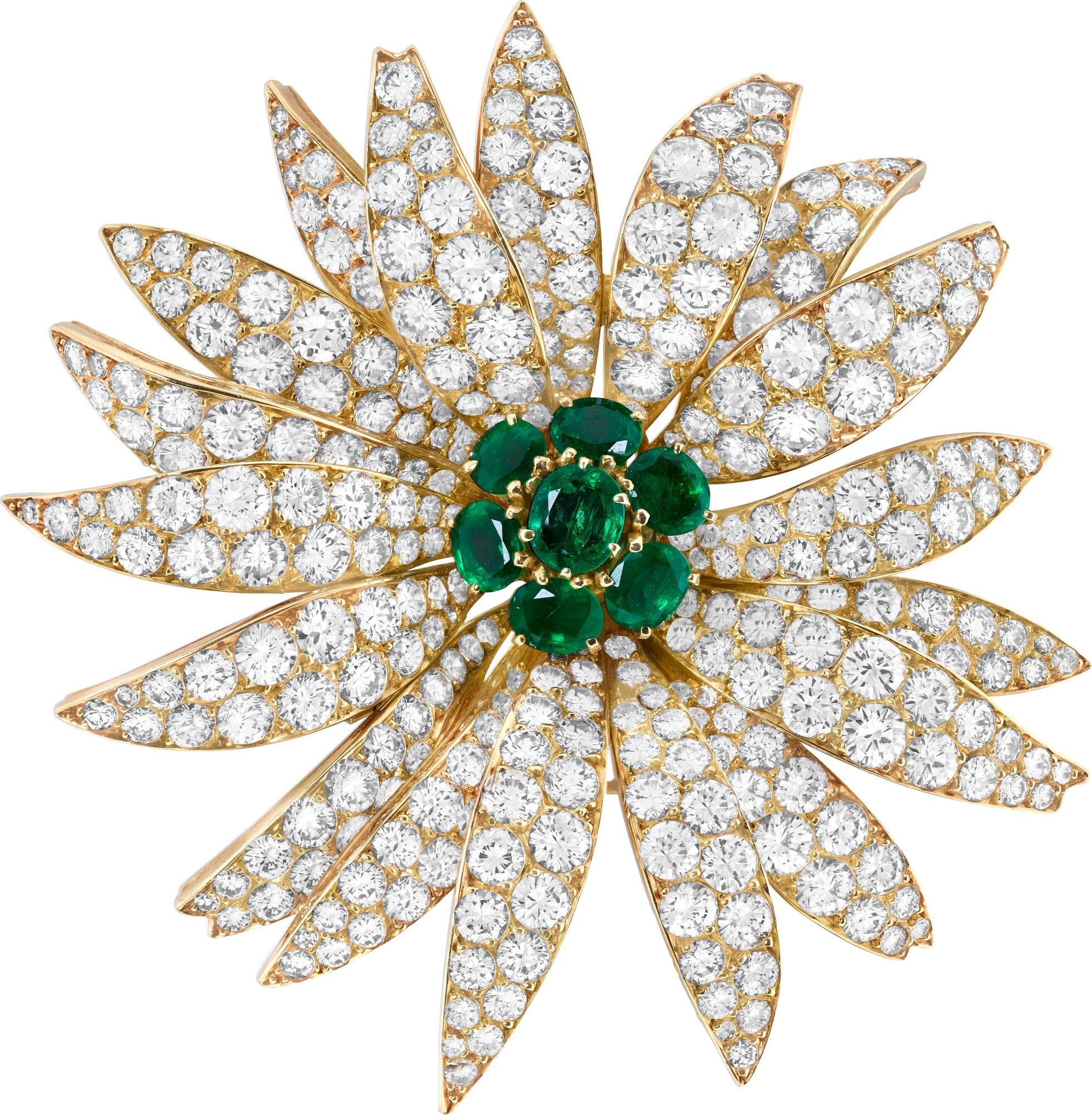 1964年のこのクリップは、自然主義に則り可能な限り忠実に花を写し取っています。繊細な花びらが精巧に重ね合わされ、まるでそよ風に吹かれて浮かんでいるかのようです。こうした配置によって立体的なボリュームが生み出されるとともに、各要素の一つひとつのシェイプが、このアンサンブルに極めてリアルな動きと生命感をもたらしています。このような手法は、創造性溢れるメゾンのヘリテージに則したものである一方、素材の組み合わせは1960年代のスタイルの典型です。ダイヤモンドをセットする土台として、伝統的に好まれていたホワイトゴールドやプラチナに代わり、より鮮やかな輝きを放つイエローゴールドが選ばれました。この色調は、雄しべを想起させる7石のエメラルドによってさらに引き立ちます。日中身に着けるジュエリーはイエローゴールドとカラーストーン、イブニング用にはホワイトゴールドと貴石という区別がはっきりとなされていた当時において、この作品はそうした慣習をエレガントに打ち破りました。