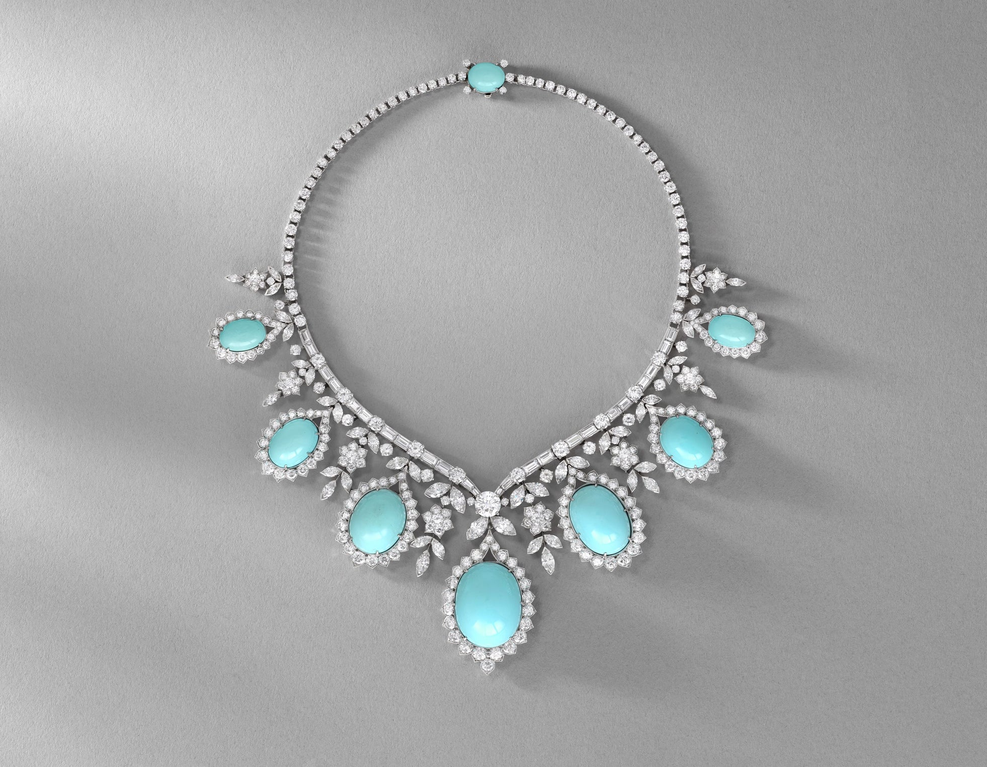 こちらのネックレスは、上記のような芸術的伝統がヴァン クリーフ&アーペルの創造性に与えた影響を示す作品です。ネックレス下部に、ダイヤモンドをあしらった花綱飾りが連なっています。この花のモチーフと交互に、7石のターコイズのカボションが徐々に大きくなるように配され、中央のターコイズ ペンダントで左右のラインがひとつに交わります。本作品に見られるこれらの要素は、ブルーの石とダイヤモンドの組み合わせと相まって、18世紀に人気を博したリングを彷彿とさせます。これらのリングは「デイジー」と呼ばれ、小さなダイヤモンドが中央の石を取り囲むデザインを特徴としていました。