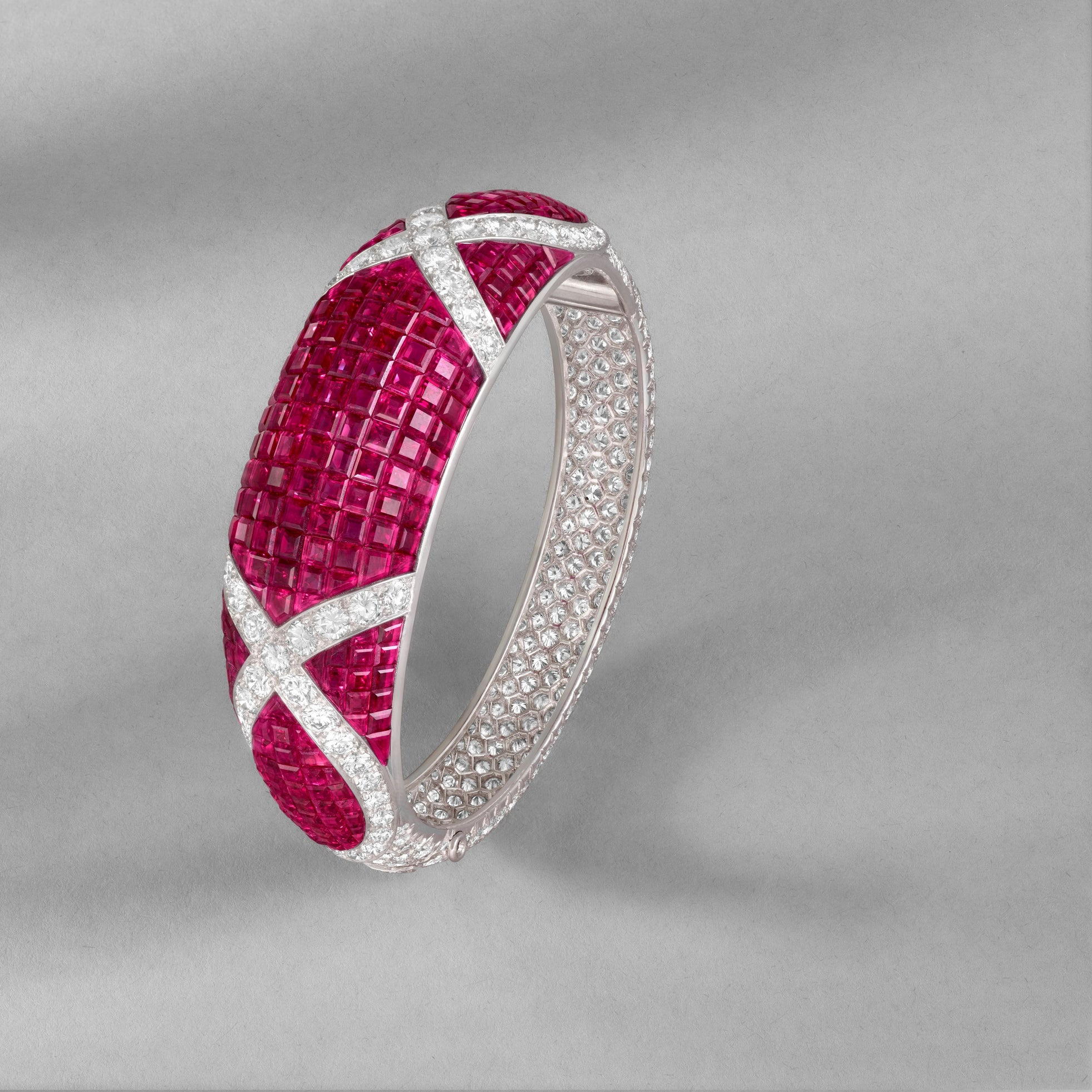 1933年に特許を取得したミステリーセットは、以来、ヴァン クリーフ&アーペルのスタイルのアイデンティティに大きく貢献してきました。宝石を固定する土台を隠すこの技法によって、表面に魅惑的で深い色合いが生まれます。この作品では、トラディショナル ミステリーセット ルビーがブリリアントカット ダイヤモンドとコントラストを成しています。また、クロスステッチのモチーフを描くダイヤモンドは、メゾンにとってもうひとつの大切なインスピレーション源であるクチュールを想起させます。特徴的な時代の技法やスタイルが調和したこの作品は、ヴァン クリーフ&アーペルがどのようにヘリテージを生かしながら、多様な要素が融合する作品を創り出してきたかを物語っています。