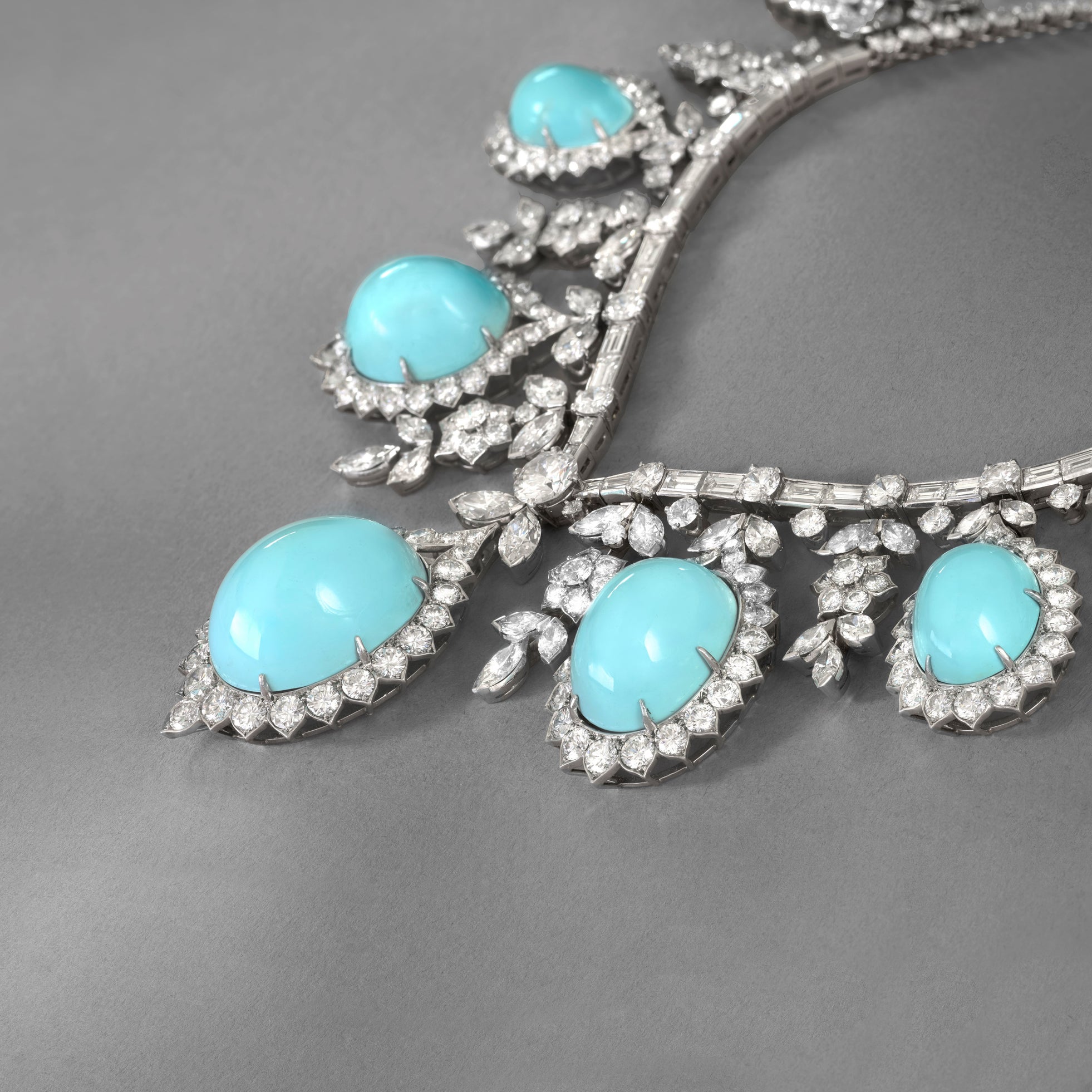 1955年に制作されたこの作品は、ある点で上記のような古い時代の作品とは異なります。ヴァン クリーフ&アーペルは、伝統的なファセットを施したストーンをターコイズ カボションに置き換えることで、そのカラーとシェイプの相乗効果により、作品全体に生き生きとしたモダンな表情を添えています。