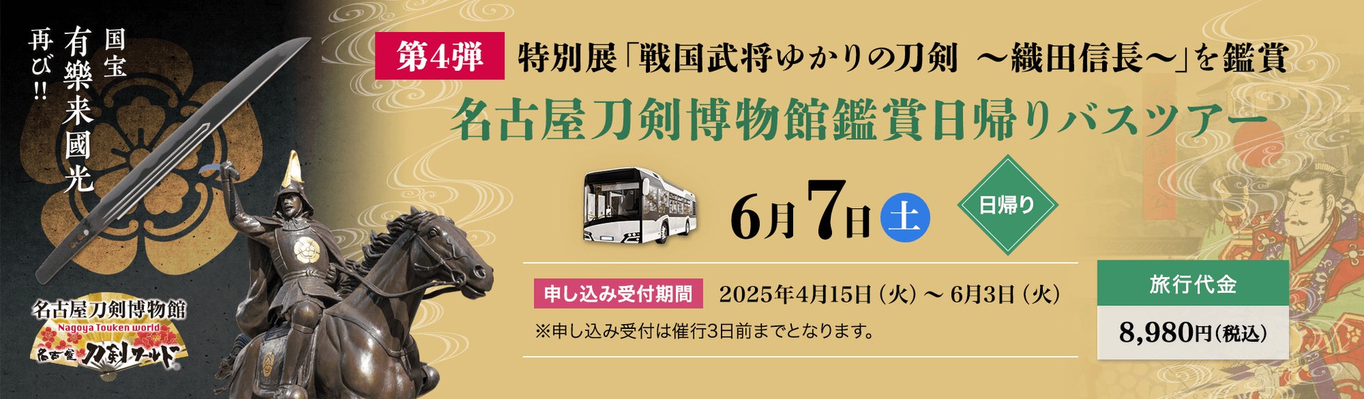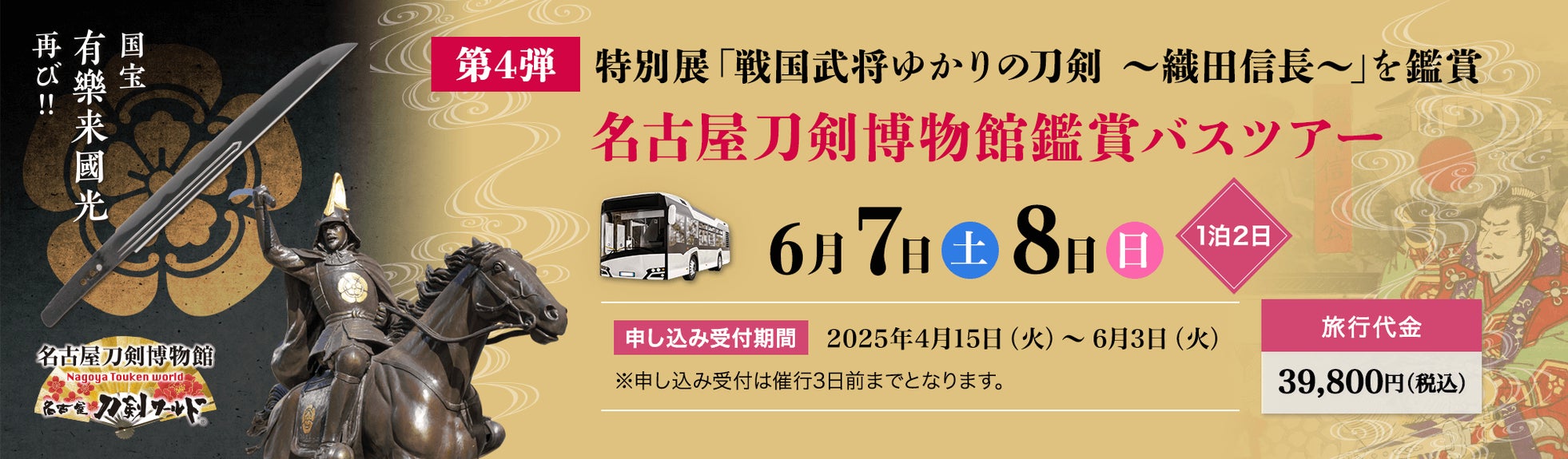 2025年(令和7年)6月7日(土)、特別展「戦国武将ゆかりの刀剣~織田信長~」を鑑賞する日帰りツアーを宿泊ツアーと同時催行します。