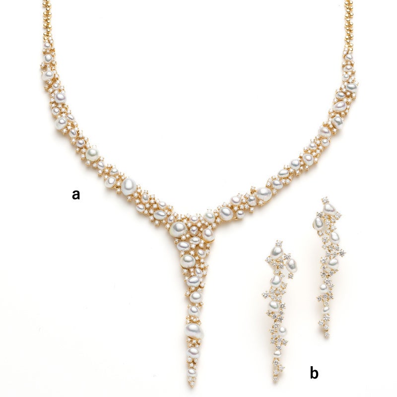 自然の奇跡から生まれた希少なアコヤケシパールを数年かけて集め、華やかなネックレスとピアスに仕立てました。<森パール>a.アコヤパールネックレス<1点限り> 5,720,000円 (K18YG/内径長さ約40cm) b.アコヤパールピアス<1点限り> 1,760,000円 (K18YG/D=計1.98ct)