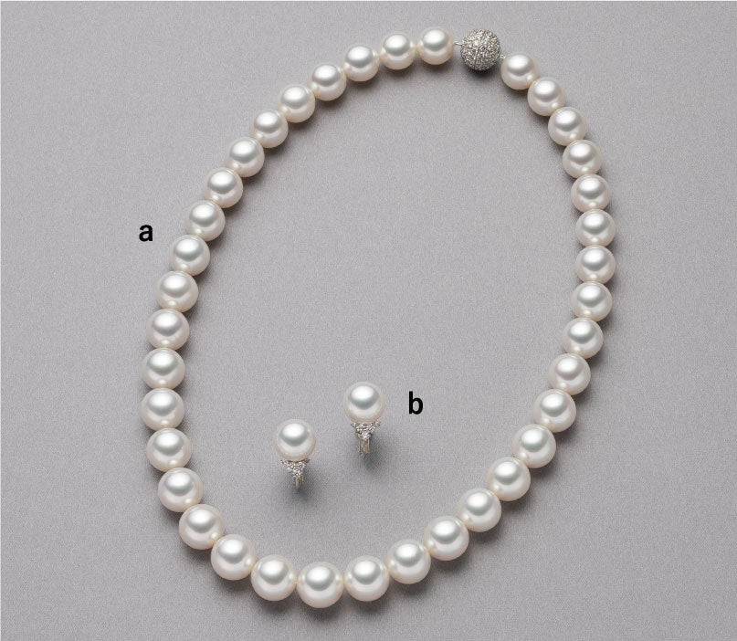 <森パール> a.白蝶パールネックレス <1点限り> 9,460,000円 (K18WG/11.0~12.4mm玉/D=計2.55ct/長さ約45cm) b.白蝶パールイヤリング <1点限り>1,320,000円
