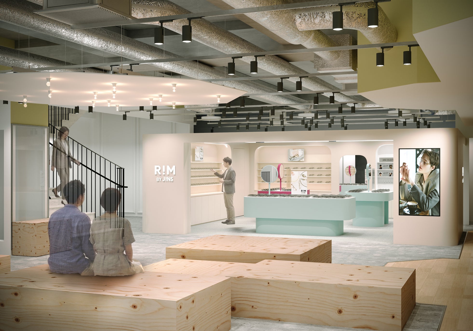 2階は、JINSの姉妹ブランド「RIM」のインショップや視力測定補助コーナーのフロア。RIMは「『今』がある、ぜんぶここに。」をコンセプトに、大きなラウンドシェイプのミラーが特徴的な柔らかい雰囲気の内装で、トレンドのアイウエアをファッションとして直感的に選べる空間を展開。人気のメガネケース刻印サービス「MAKE IT YOURS!!(メイク イット ユアーズ)」も導入し、ご購入者さまを対象に、漢字やアルファベットなど最大30文字まで刻印可能なサービス(有料)を提供。世界に一つだけのケースが作れるパーソナルな体験をお楽しみいただけます。