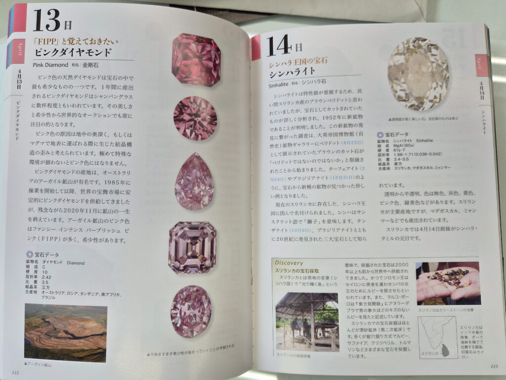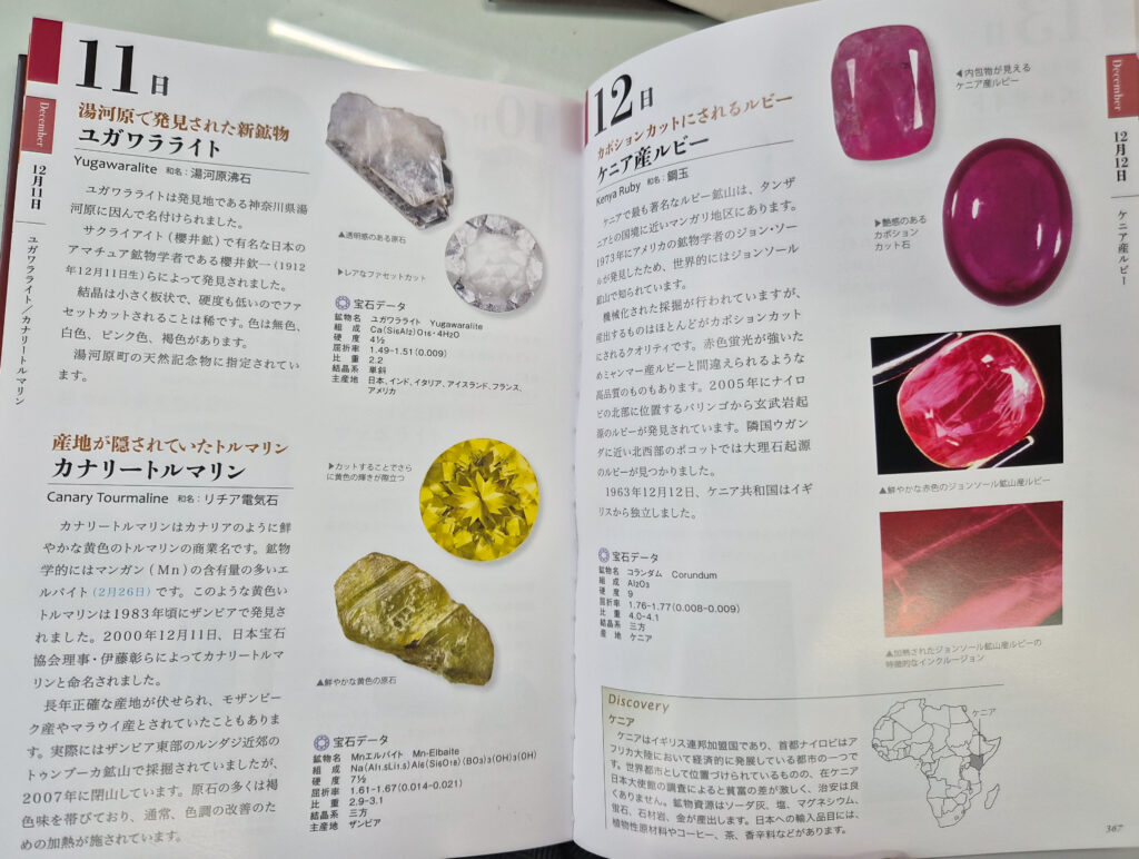 「366日宝石図鑑」は、1月1日から12月31日まで(うるう年の2月29日を含む)の各日に、由来のある宝石を1種類~3種類ほど設定し、日めくりのように楽しみながら美麗な宝石それぞれの深い知識が身につく図鑑として製作された。