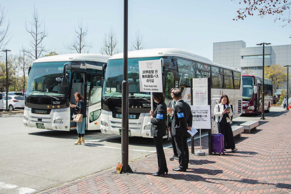 甲府駅から会場までの無料循環バスが運行されるとともに、フェア会場へのアクセスの向上を目的に、昨年まで実施していたJR東京駅から会場直行バスに追加で、横浜便、名古屋便が加わる。料金は片道1,000円と格安な上に、会場内で使える1,000円分のチケット(飲食など)がもらえる。