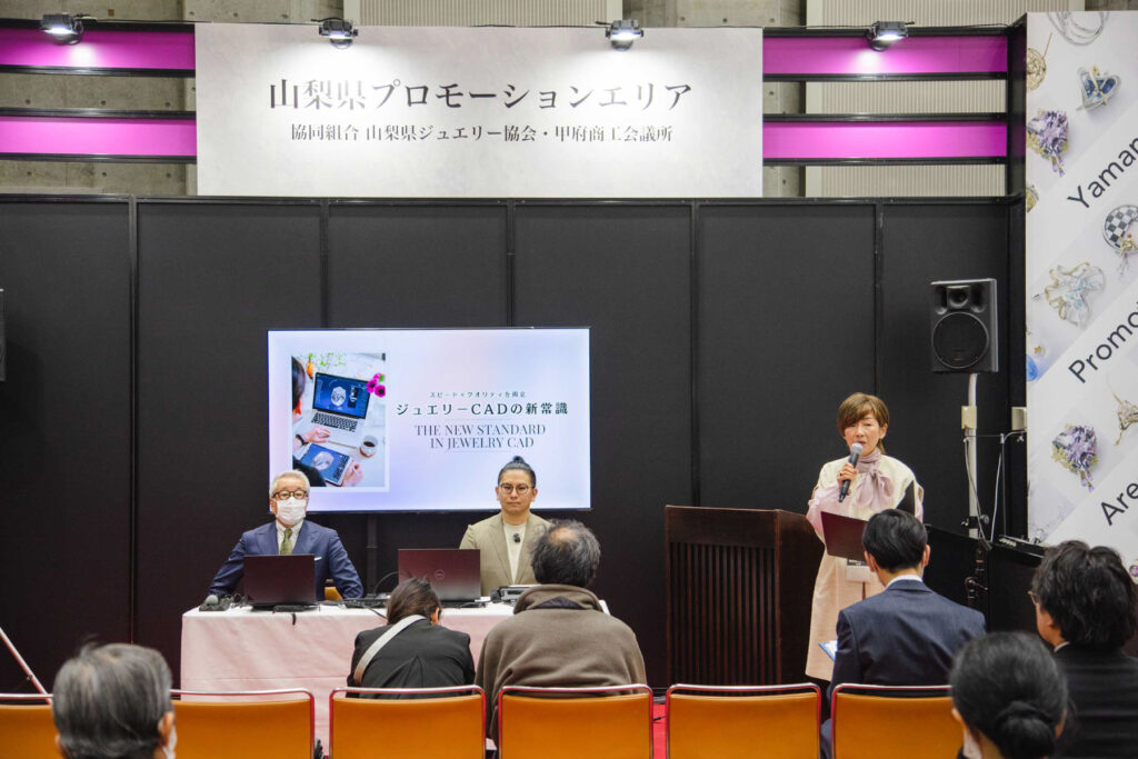 産地山梨の魅力をより知ってもらうための企画として、山梨県ジュエリー協会の宝石研磨部会、貴金属工芸部会、水晶美術彫刻部会の職人による加工実演を披露。加工相談や企業マッチングなどの相談にも対応する。