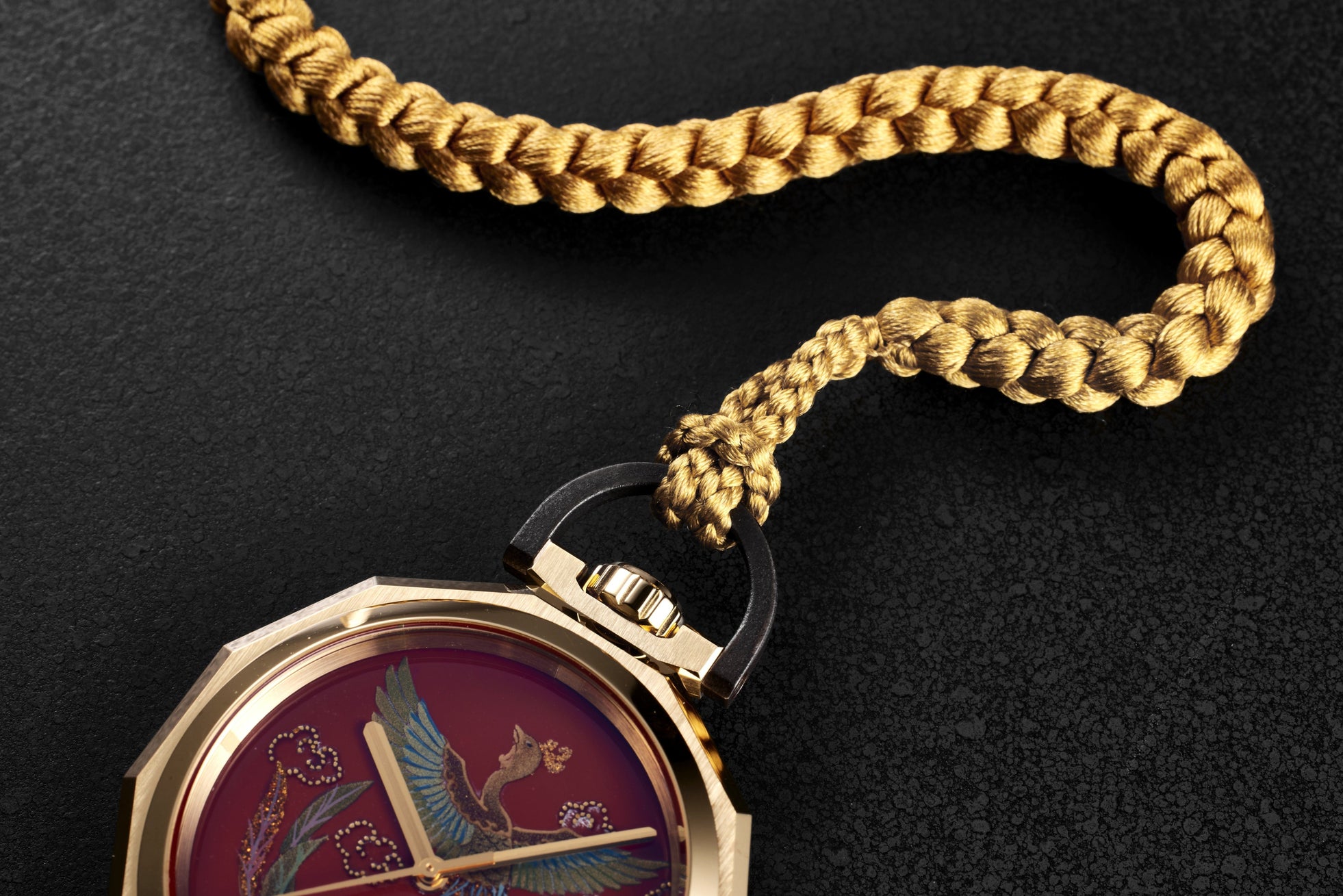 鳳凰は、伝説の霊鳥で、鶏の頭、鶴の羽、孔雀の尾羽を持った姿で描かれます。徳の高い王が現れ、天下泰平が訪れる吉兆を告げる鳥とされてきました。日本では平等院鳳凰堂や金閣寺の鳳凰像が有名です。円形の文字盤の中に、鳳凰が生き生きと羽ばたく構図は漆芸家 箱瀬氏の真骨頂と言えるでしょう。肉眼では見ることのできない鳳凰の細いうぶ毛までも一筆一筆精緻に描かれており、数ヶ月に及ぶ工程の最後に鳳凰の眼を、あたかも生命あるものを置くように描き入れて文字盤が完成します。提げ時計を手にする人に平安な日々が訪れることを心からお祈りします。