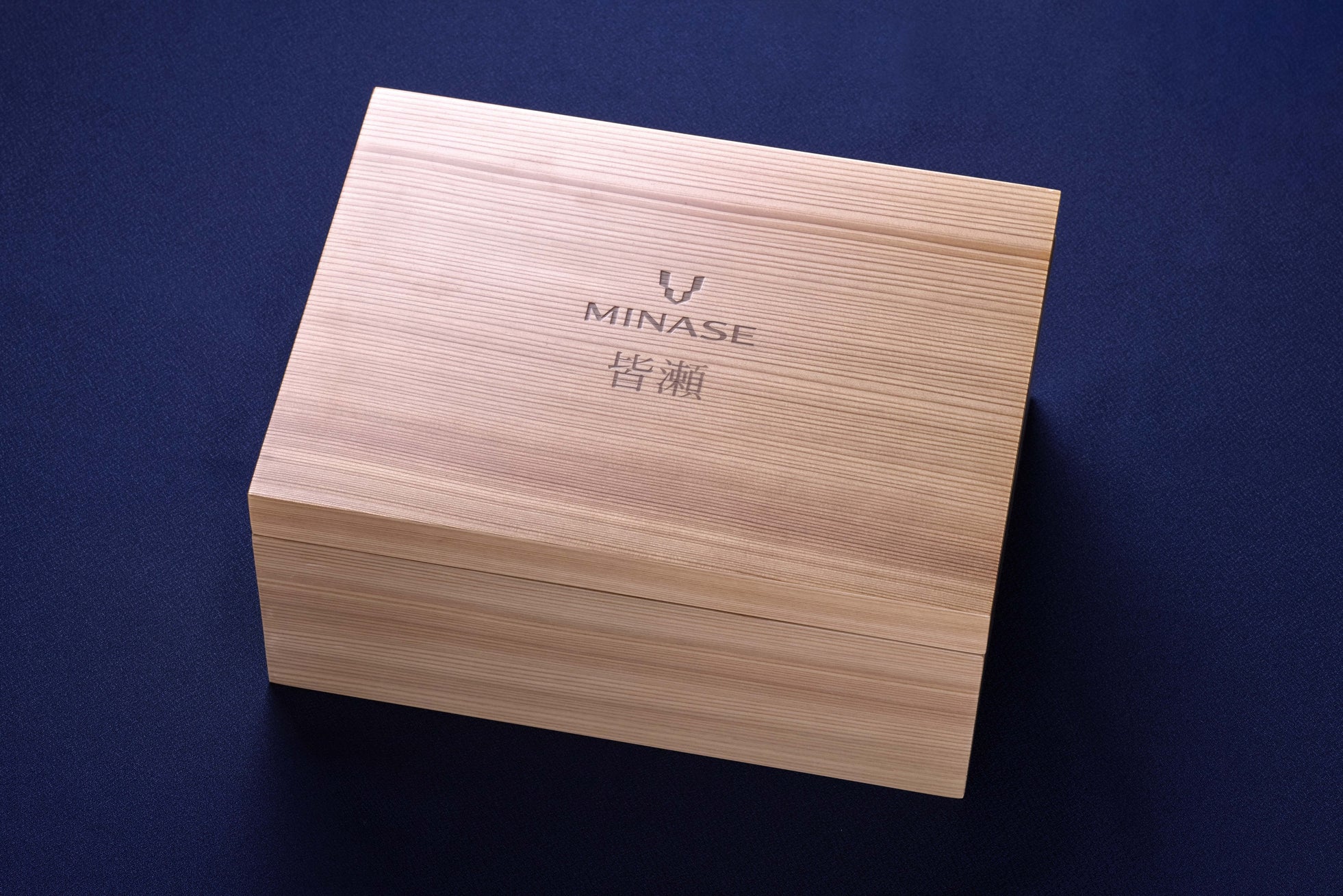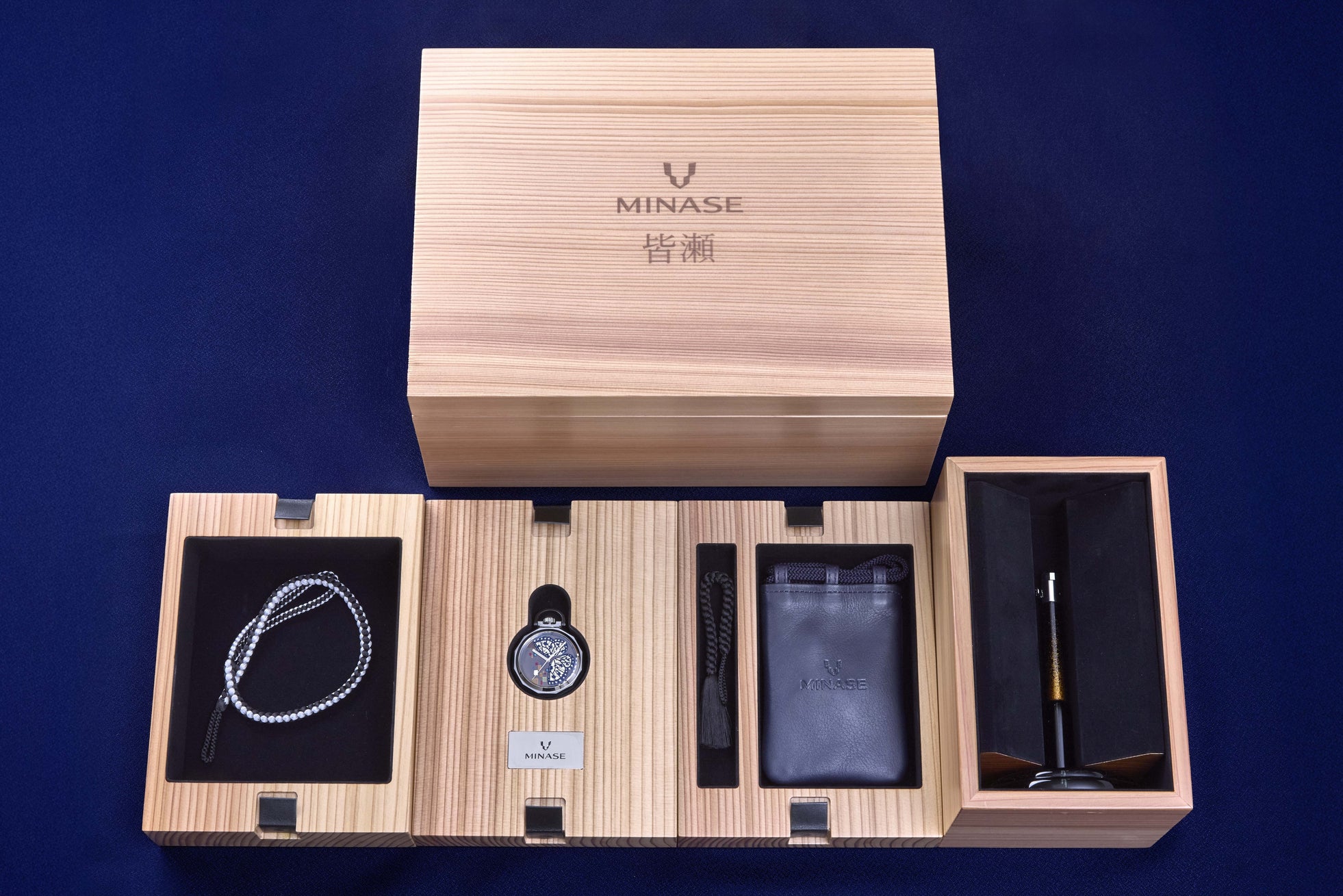 提げ時計には、秋田杉を使用した特製ボックスが付属します。本ボックスは、皆瀬工場の近隣にある木工メーカーにより製作されたものです。蓋にはMINASEのロゴと漢字表記の「皆瀬」の焼き印が施され、素材の温もりとブランドの存在感をさりげなく表現しています。ボックス内部にはウォッチスタンドを収納することができ、提げ時計の保管用としてはもちろん、ジュエリーボックスとしてもお使いいただけます。