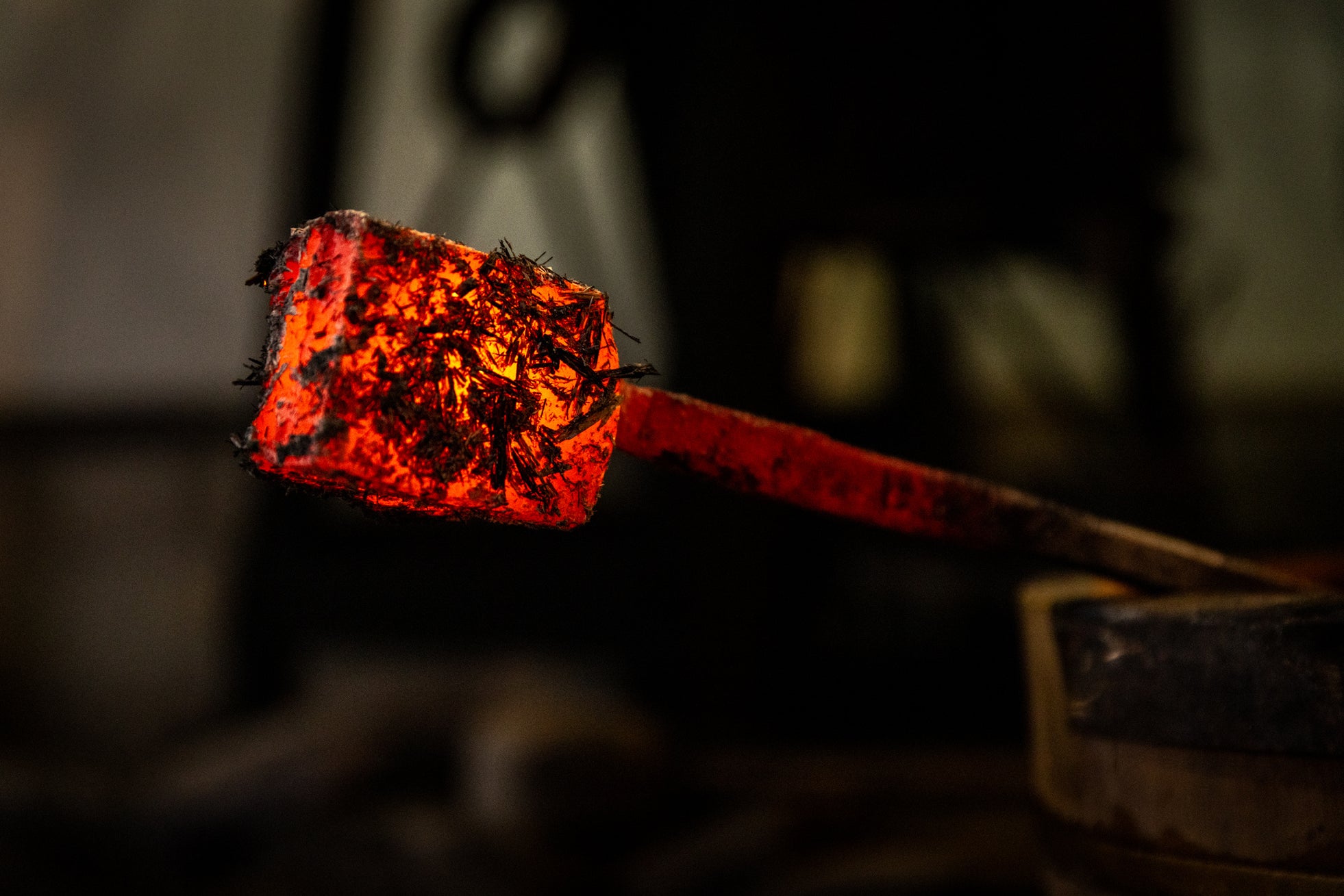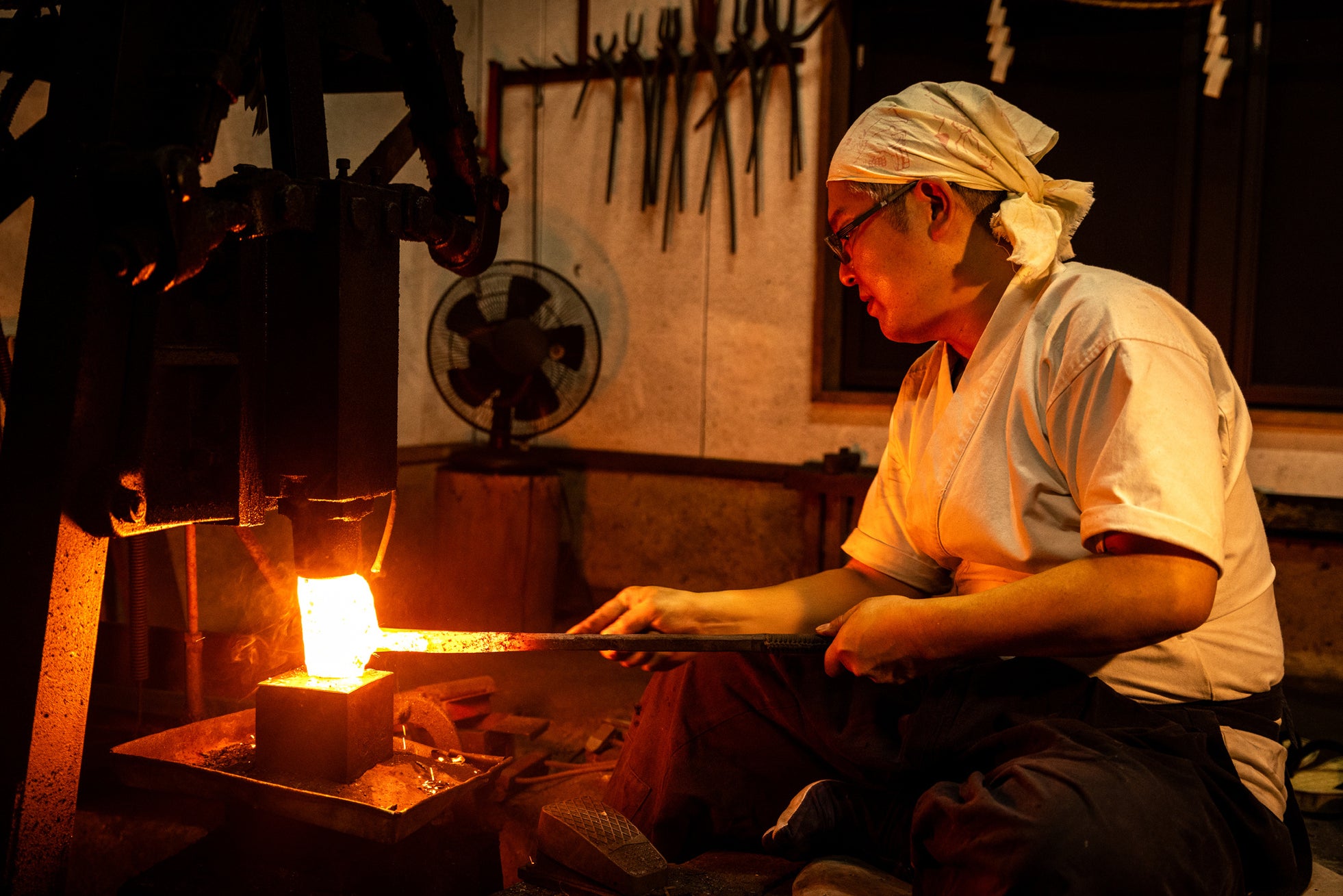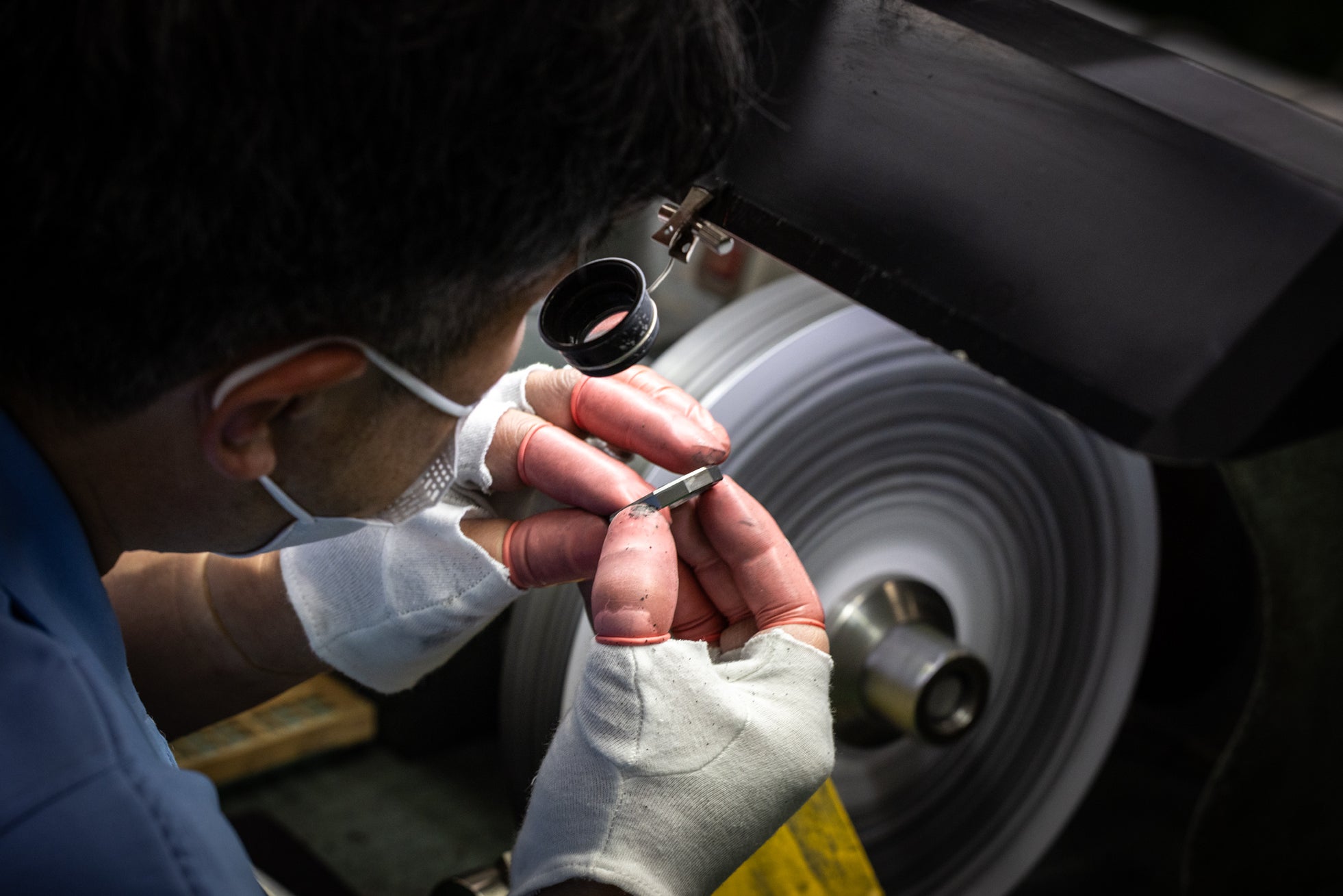 玉鋼(たまはがね)とは、日本刀の材料になる(材料として生産される)特別な鋼です。日本の古式製法、たたら製鉄によって精錬された鋼の中でも炭素含有量が少ない良質なもの(不純物が極めて少なく、炭素含有量が1%前後の均一な鋼)をこう呼びます。刀匠は、木炭が燃え盛る高温の炎の中で玉鋼を赤々と熱し、槌で平らに伸ばし、層に折り畳むという工程を何度も繰り返します。叩いて、叩いて、叩き続けるうちに鉄が燃え尽き(不純物と鋼が燃えて)、もともと7~8kgあった玉鋼は、最終的に700g(1kgほど)の高純度の鋼へと鍛え上げられます。こうして鍛えられた鋼を、皆瀬工場で裏蓋と吊り環に加工し、それを再び刀匠のもとに送り、錆をつけては削る作業を何度もくり返しています。まさに日本刀と同じ鋼を使って裏蓋・提げ環を製作しました。