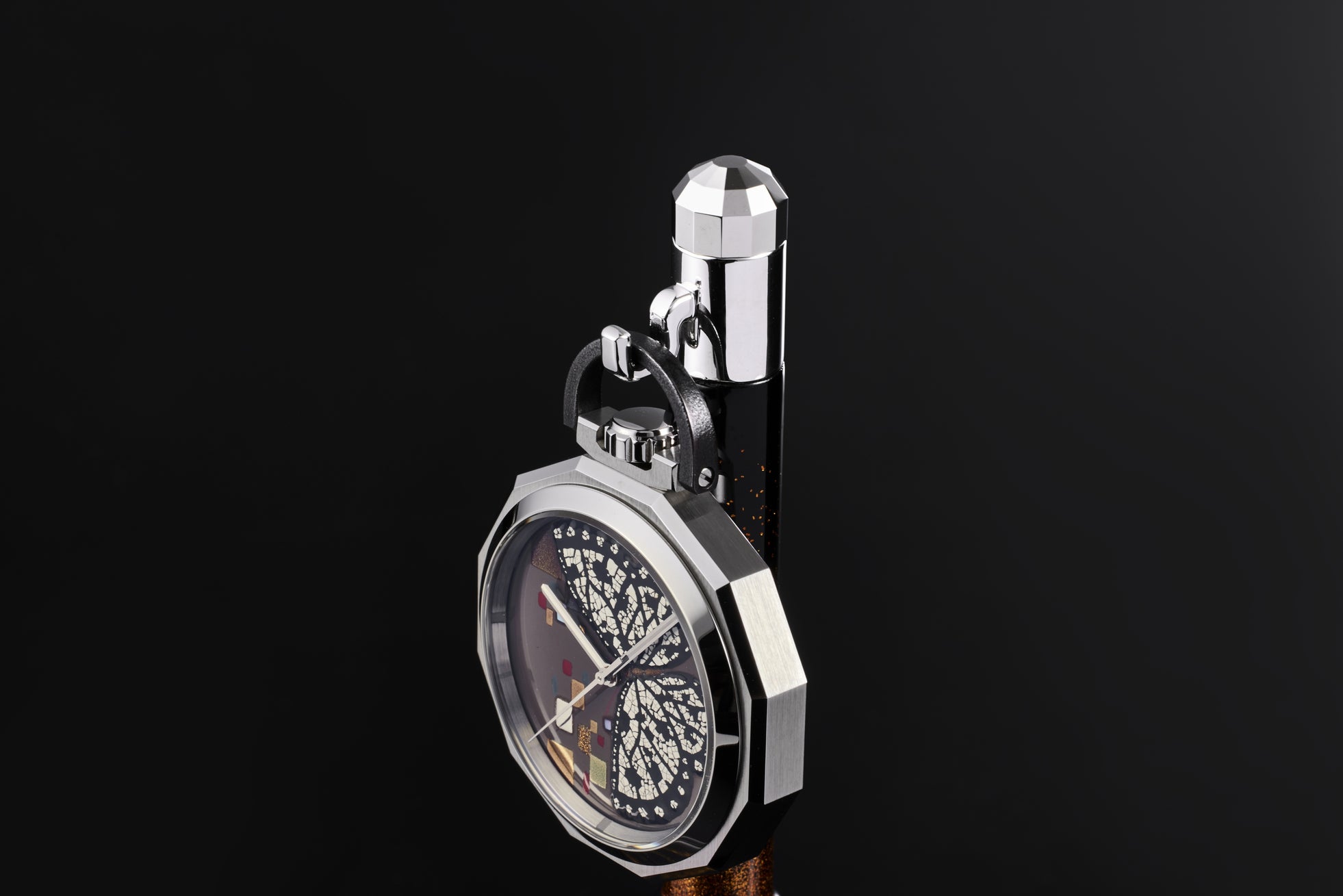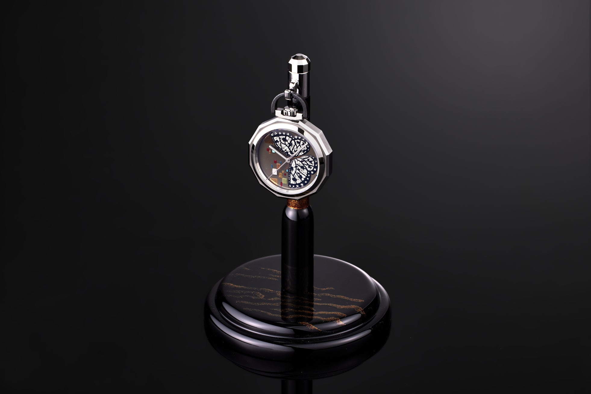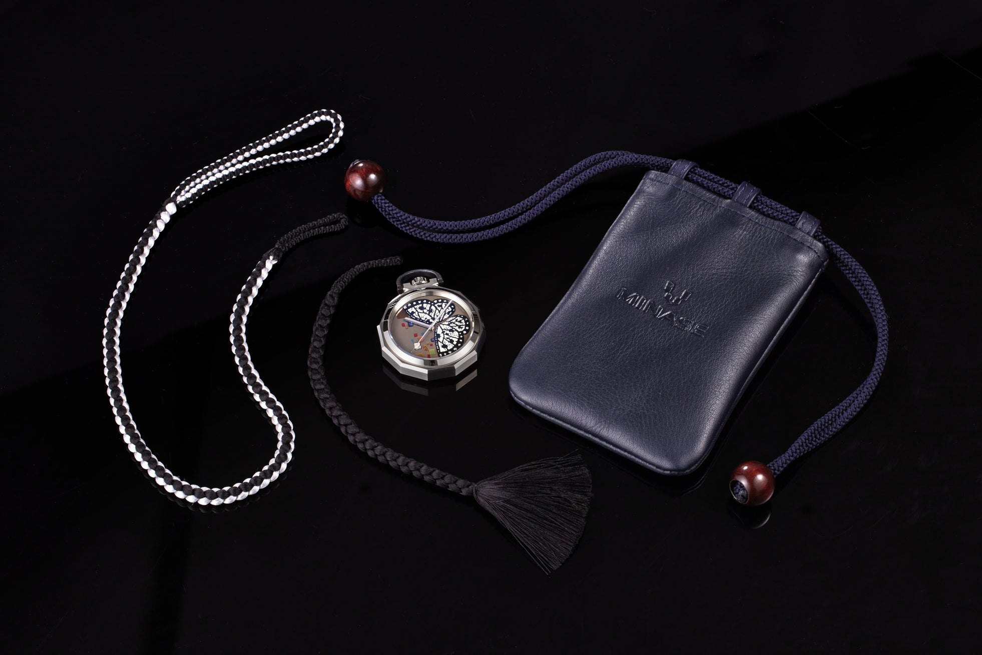 日本の匠の技を、最もMINASEらしく表現するものとして、頭の中に浮かんだのが、提げ時計でした。蒔絵の細工、日本刀の錆、ザラツ研磨のエッジを手の中で”愛でる”ために造られた12角形のフォルム。”愛でる”とは、日本固有の美に対する感性であり、美しさを放つ存在に心をときめかせ、質感を味わい、愛情を持って慈しむことを意味しています。MINASEの時計が、世界の人に愛でられる存在であり続けたいという思いを込めました。