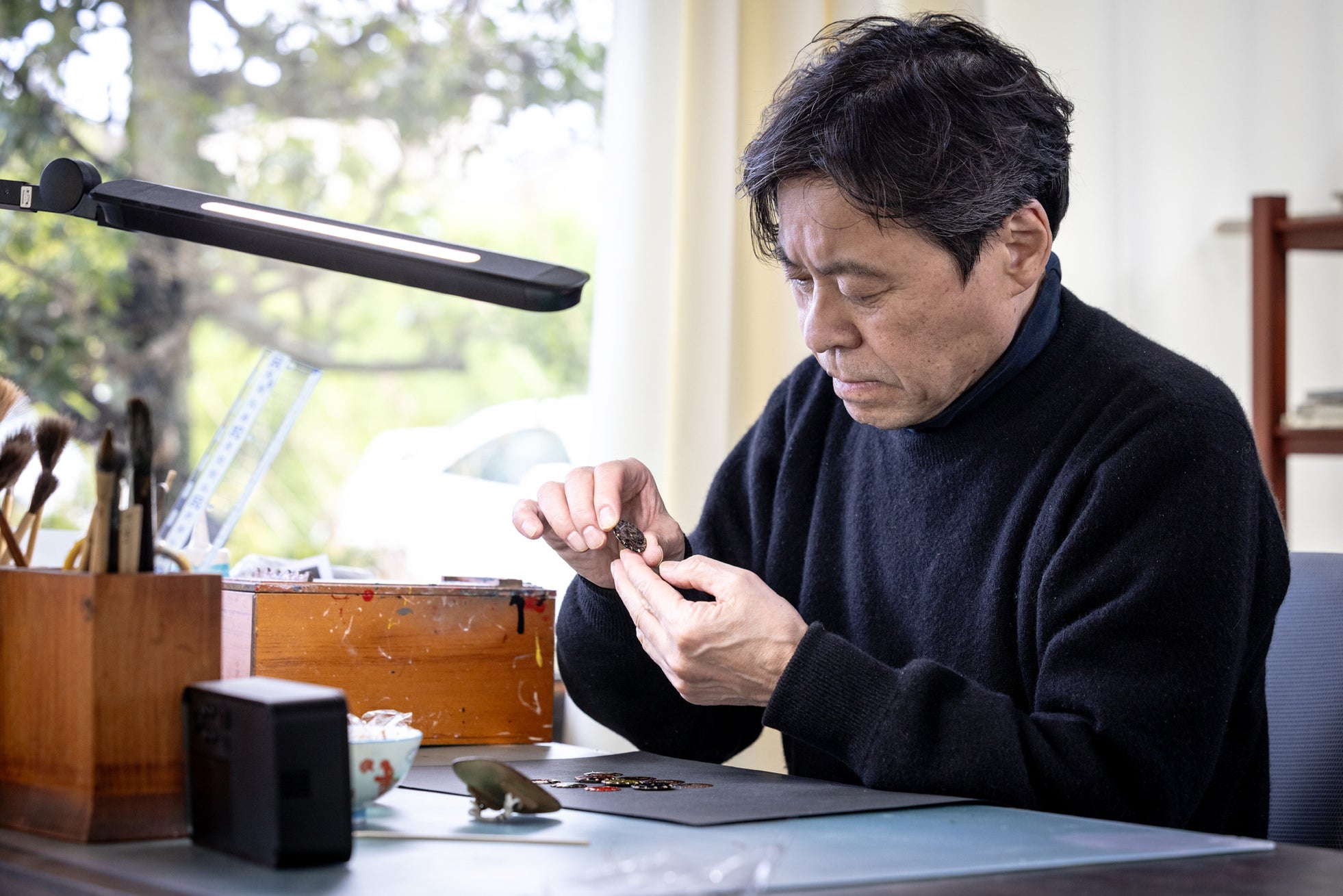 1975年に蒔絵師である田中勝氏に師事をし、5年後には独立。そこから自分の感性に従い作品を作り続けてきた。時には時代に抗い、きらびやかな蒔絵が全盛期とあれば敢えて無地の漆器を作り周りが無地に寄れば、自分を蒔絵で表現した。あまのじゃくとも思われながらも、自分を応援してくださる人たちがいた。これからも自由に、その時代に合った漆の表現を極めていきたいと思う。(箱瀬 淳一)